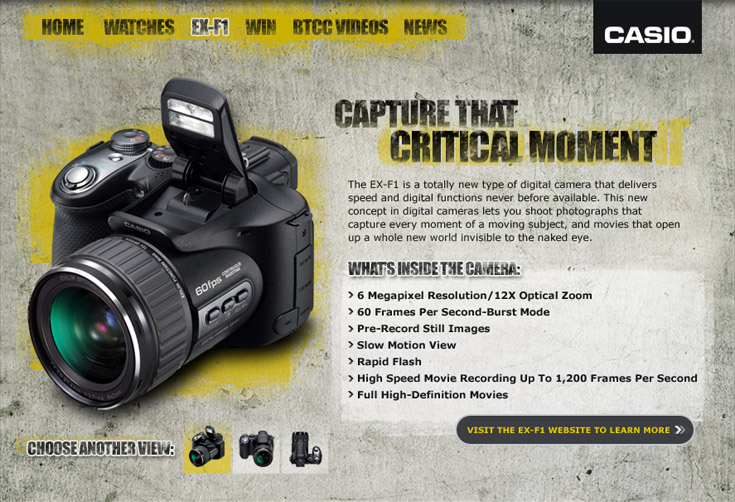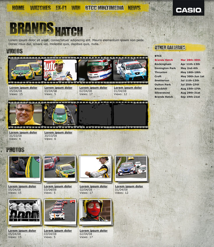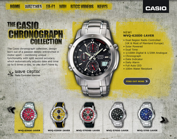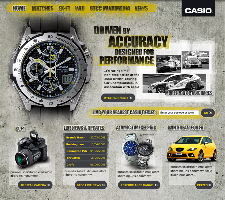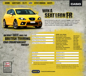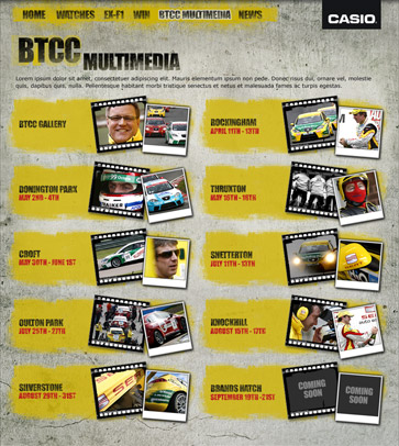 A microsite to promote Casio's involvment with the British Touring Car Championship. Featuring images and videos from the races! The site also promotes Casio's high quality range of watches and digital camera. |