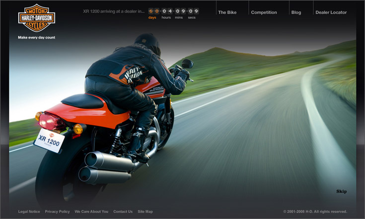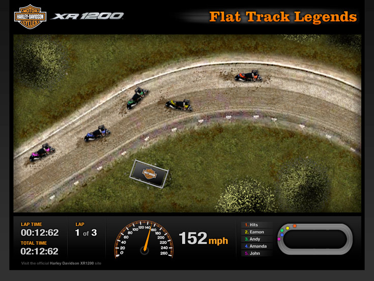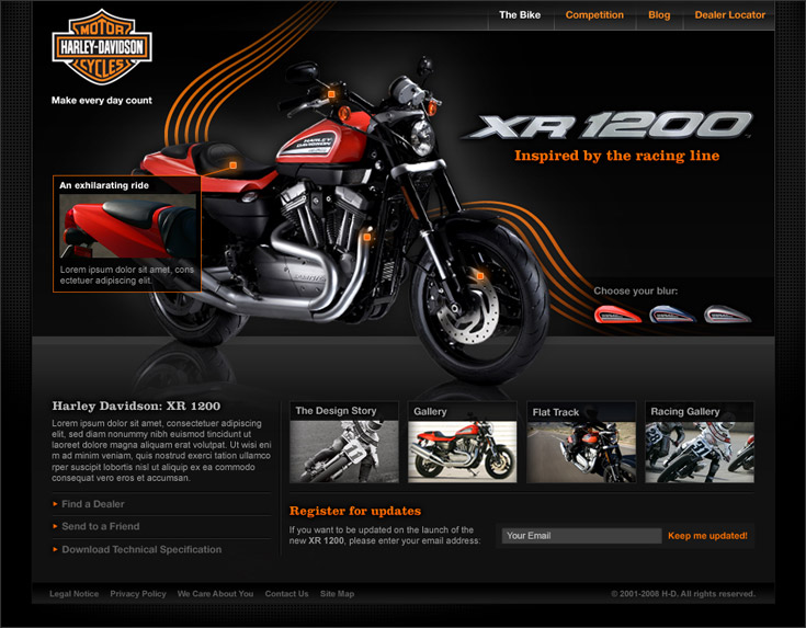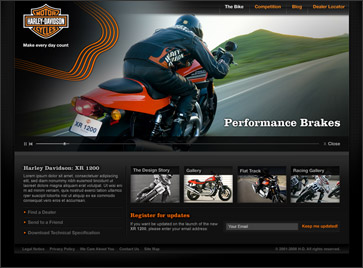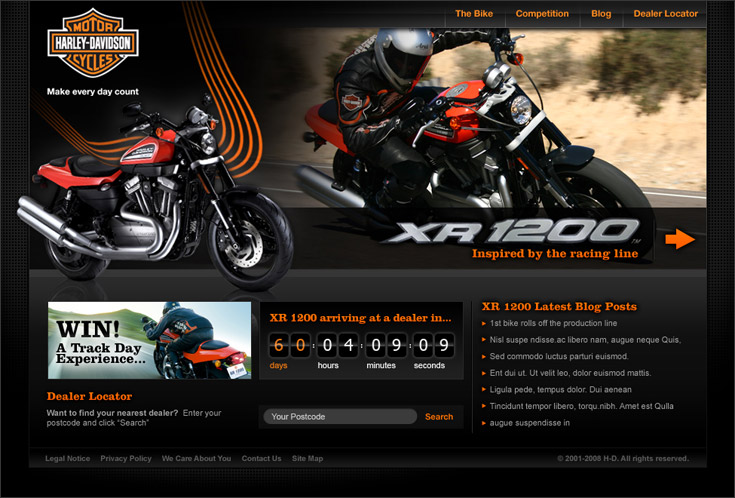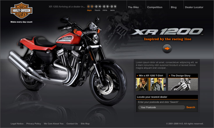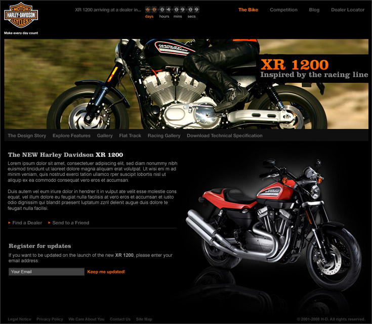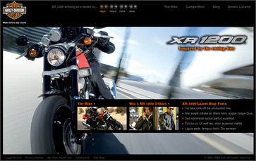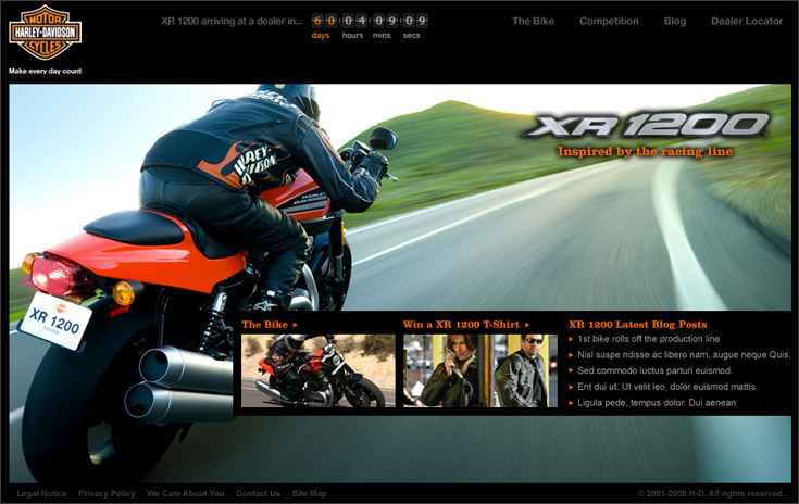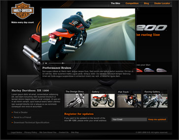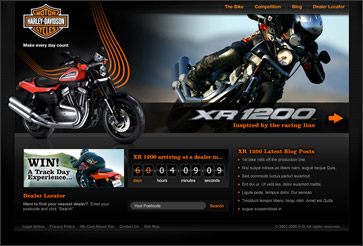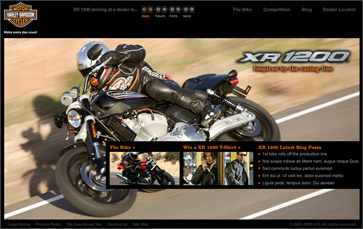 The all new Harley Davison XR1200, a racing bike made for the road. The site's main objective was to show the bike off using various videos and images. I came up with 3 concepts to do just that! |