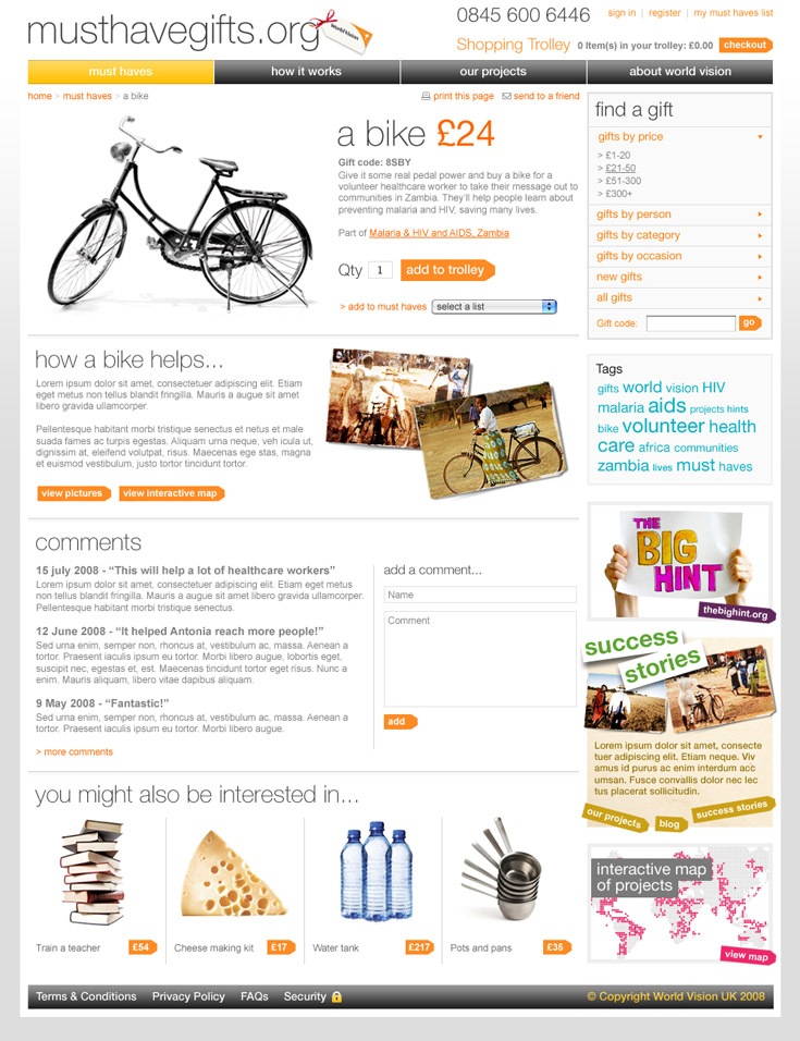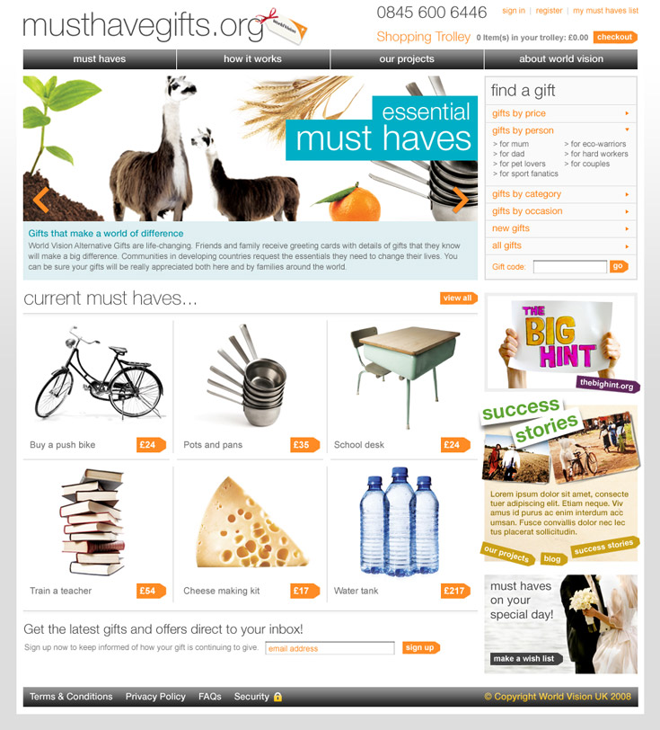 Website for World Vision's Must Have Gifts. A different take from the usual charity site. This was made to work more as a catalogue/magazine, which gave the website a different twist. A microsite to support the website, gave users the chance to tell friends and family what they would prefer for a present. |